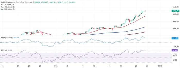 周二(1月27日)亚市盘中,现货黄金延续强劲上涨走势,目前金价位于5077美元/盎司附近,日内暴涨约70美元。FXStreet首席分析师Valeria Bednarik撰文,对黄金技术前景进行分析。